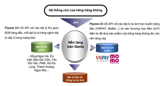 Flyone tích hợp API từ các hãng hàng không vào nền tảng bán (Genie), sau đó cung cấp cổng kết nối (API Gateway) cho các Đại lý thu gom và Đại lý trực tuyến (OTA) hàng đầu tại Việt Nam để đưa sản phẩm của các hãng hàng không đến tay người dùng cuối.